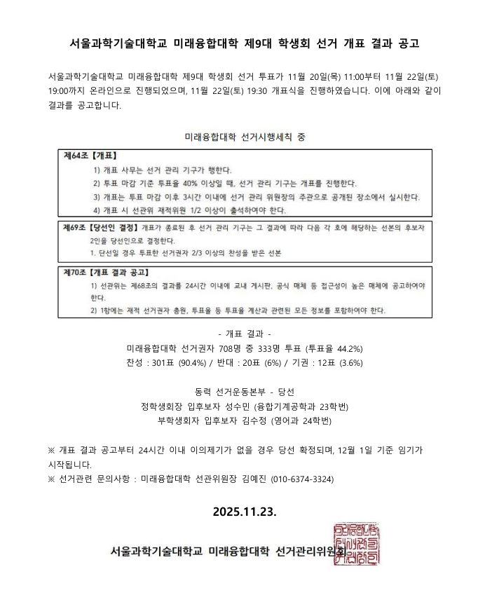 | 제목 | [선거] 미래융합대학 제9대 동력 학생회 당선 공고 | ||||